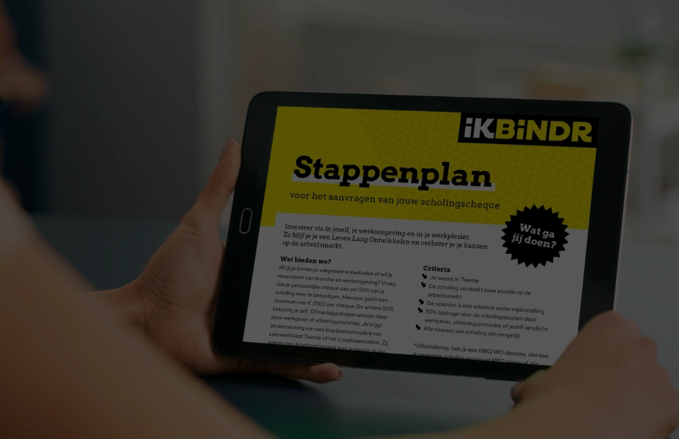 IKBINDR is de campagne van Twents Fonds voor Vakmanschap. Bij IKBINDR kun je een persoonlijk loopbaangesprek aanvragen en je aanmelden voor een scholingscheque om je scholing te bekostigen. We brengen je in contact met de mensen én de middelen die voor jou nodig zijn om de stap naar omscholing of bijscholing te zetten!